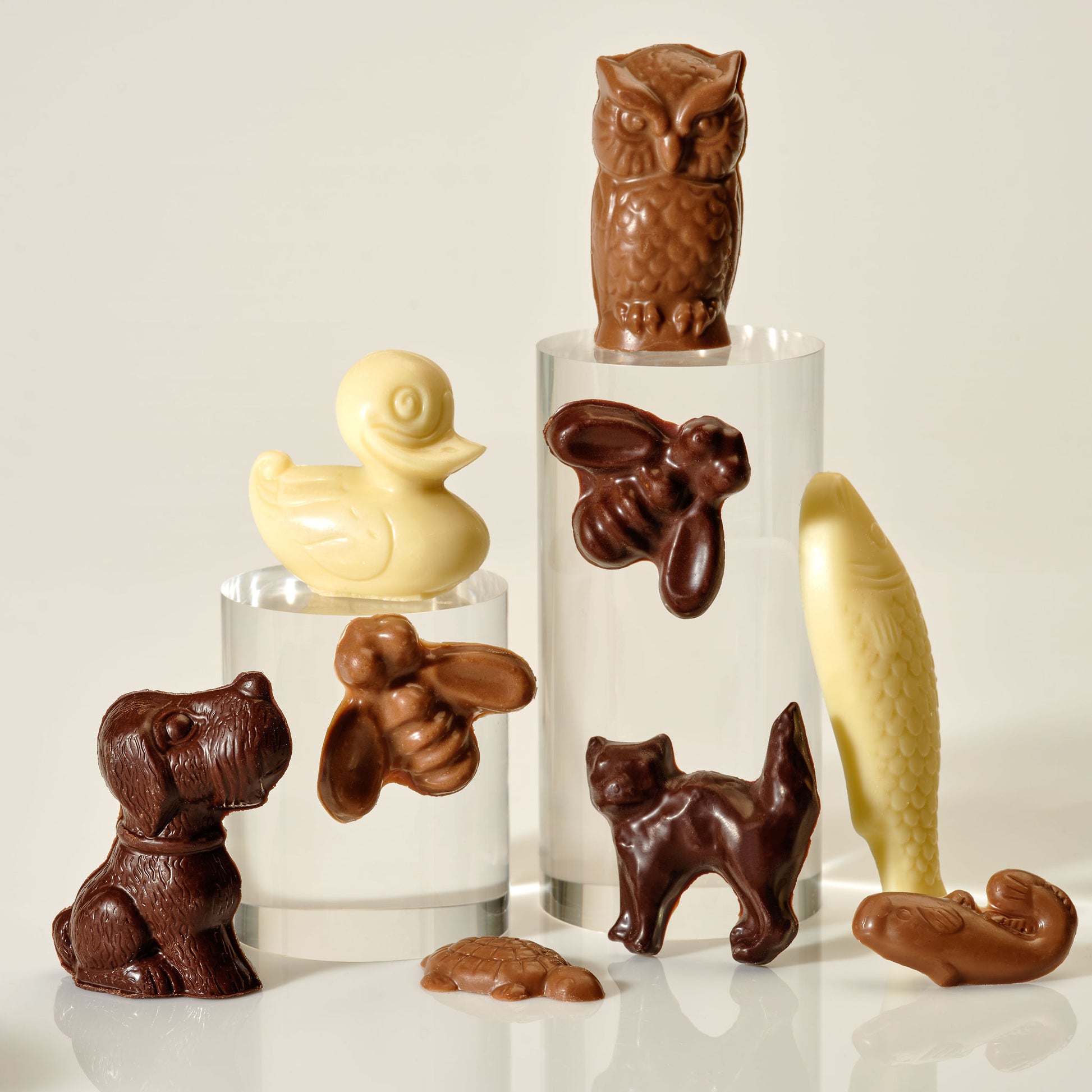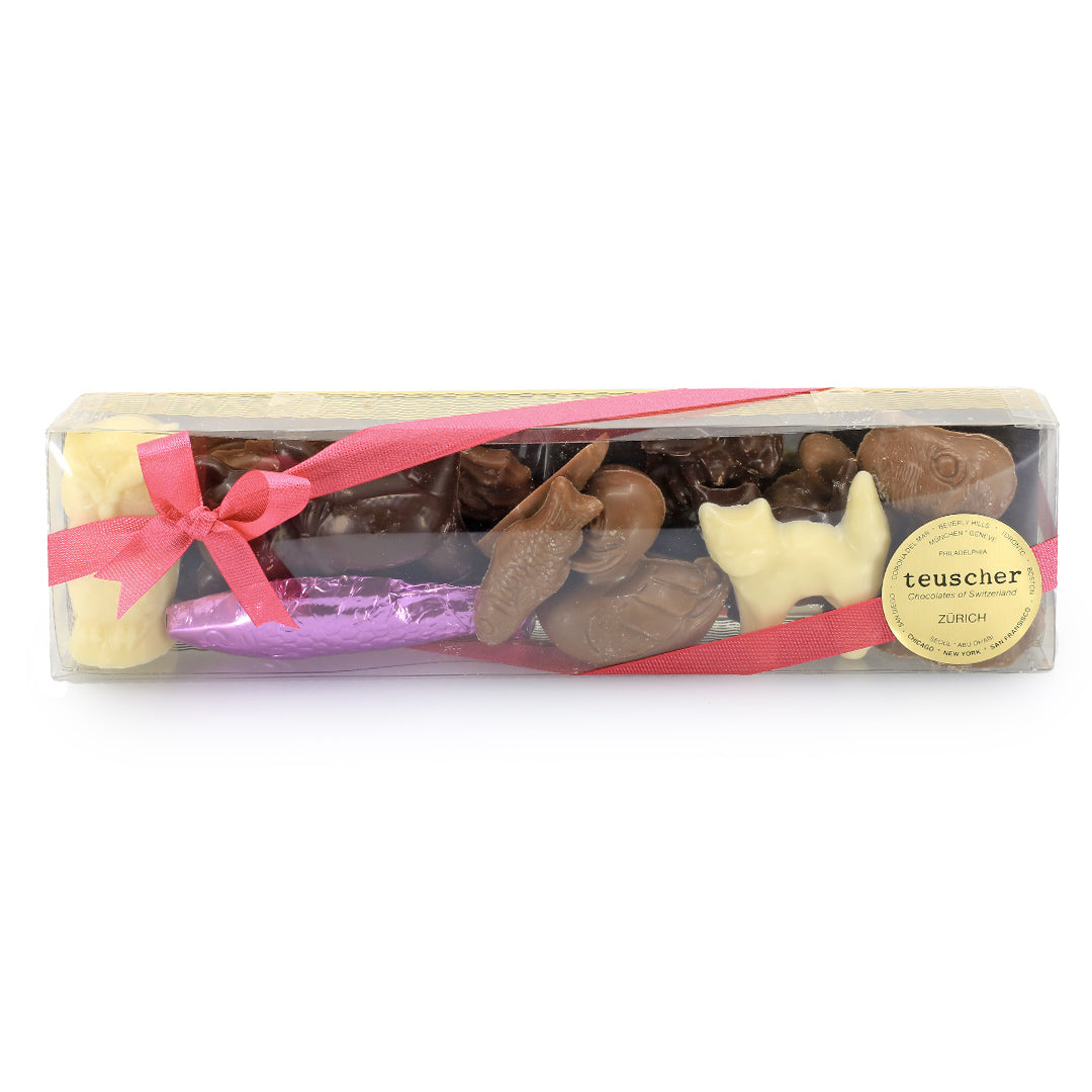 A fanciful collection of our chocolate animals. From milk chocolate fish to white chocolate kittens.