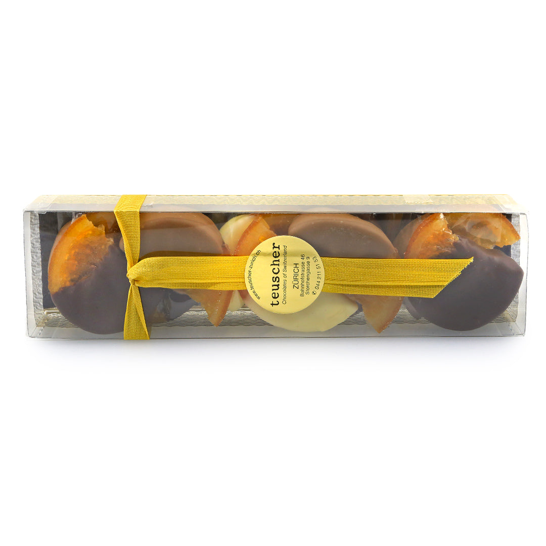 Contains dark and light chocolate of our amazing candied orange slices. 150g gift box.